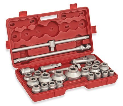 Drop forged heat treated manganese ratchets, sockets and extensions and durable sandblasted finish. Tapered 12-point socket ends for easy access to nuts and bolts and notches in sockets lock onto ratchets and extensions. Knurled pattern on ratchet handle provides excellent gripping power. Spring loaded ball bearing locks sockets securely in position and features a heavy duty metal carry case for organized storage of all components. Contains 1 piece 3/4 inch drive ratchet head, 1 piece 3/4 inch drive x 21 inch breaker bar handle, 1 piece 3/4 inch drive x 21 inch extension bar, 1 piece 3/4 inch drive x 21 inch extension bar, 1 piece 3/4 inch drive x 8 inch extension bar, 1 piece 3/4 inch drive (female) x 1 inch drive (male) adapter, 1 piece sliding t-bar adapter, 17 piece 3/4 inch drive 12-point sockets (metric): 21, 22, 23, 24, 26, 27, 28, 29, 30, 32, 33, 34, 36, 38, 41, 46, 50 mm, 3 piece 1 inch drive 12-point sockets (metric): 55, 60, 65 mm and complete with heavy duty metal storage case.